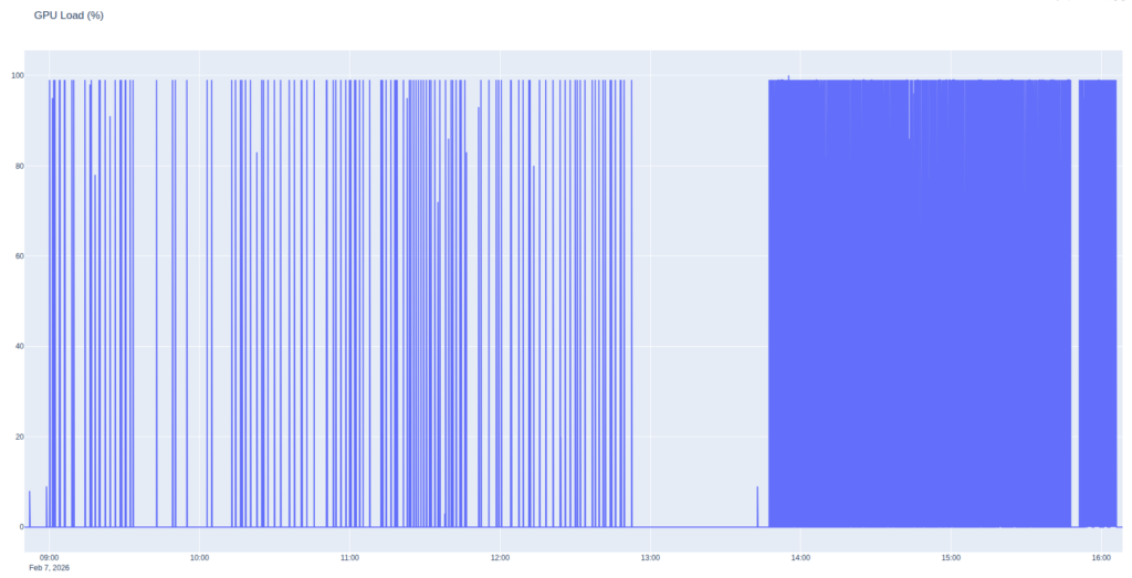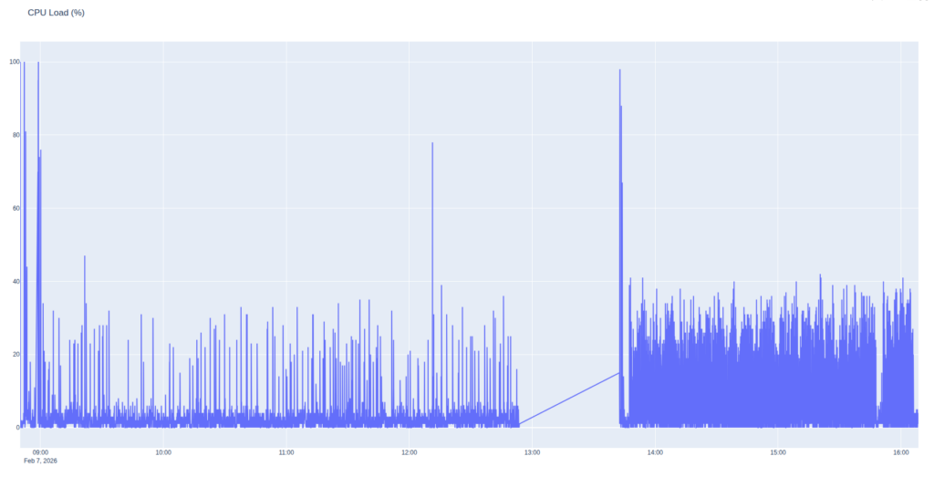 As expected, the CPU and GPU load was more intense for the fixed interval than the responsive profile. The spacing during the responsive profile in the morning shows our slower progress on the ascent followed by rapid progress as we moved across the plateau and the server worked harder to keep up with us.