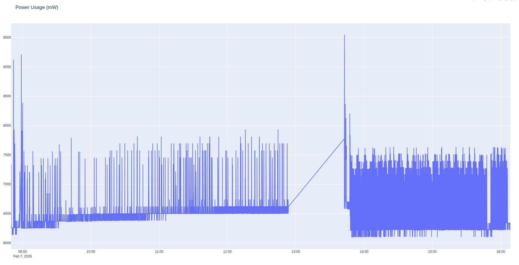 The afternoon was not affected by the ASL memory leak so we maintained a steady even profile at around 7.5W power consumption, well within the range of a phone power bank.