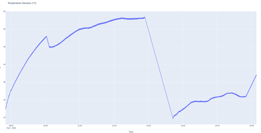 In the afternoon the unit was attached outside the rucksack in the waterproof bag where it leveled out at 32 degrees Celsius. The moment the rucksack was placed inside the vehicle before 1600 is evident as the temperature climbed steadily. This coincided with it being placed under an intense load during a driving demonstration we have published on our Youtube channel.