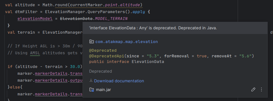 val terrain = ElevationManager.getElevation(currentMarker.point.latitude, currentMarker.point.longitude, dtmFilter)