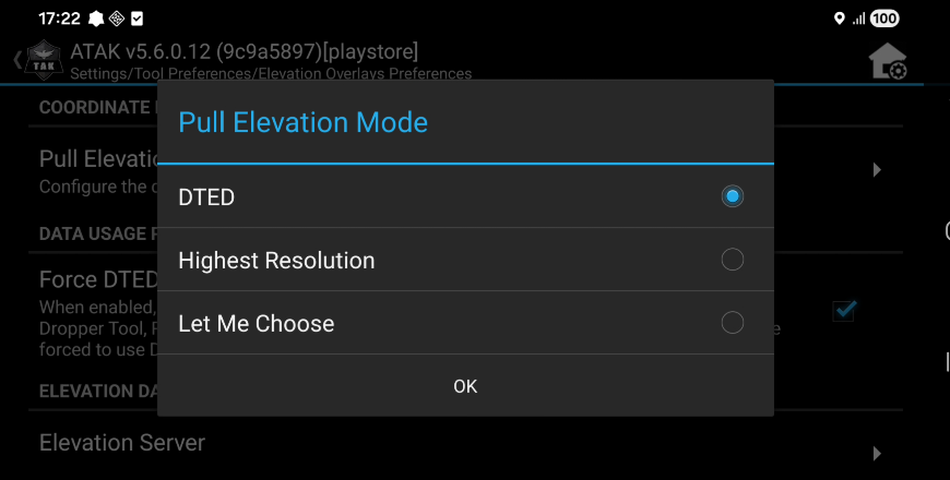 Digging into ATAK’s preferences we found validation for our theory via the “Pull Elevation Mode” option within Elevation Overlays Preferences. The choice between DTED and Highest Resolution suggests this was implemented to support better than DTED data eg. SRTM1. It is not clear if it references DTED0 or SRTM1, which as we’ve shown could be a +100m error.