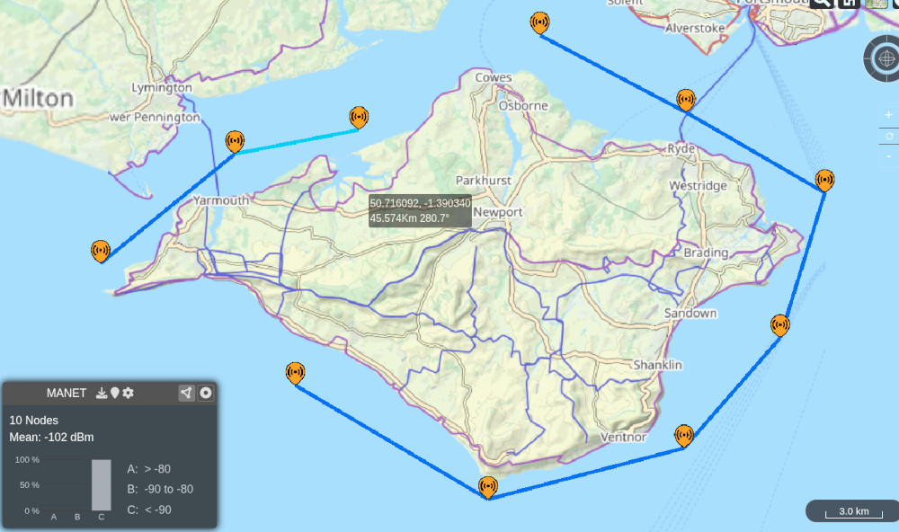 In the example below, 10 S-Band mesh radios around the Isle of Wight were modelled using Bullington diffraction with a single API request in 0.14s.
